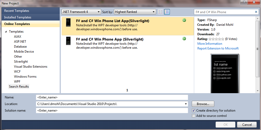 (Note: A WP7 FSharp.Core.dll has been included as part of these templates. It is also part of the Microsoft F# August 2010 CTP.)